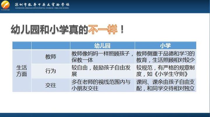 幼兒園和小學(xué)的不同之處在于學(xué)習(xí)生活環(huán)境的變化、生活內(nèi)容的變化、師生關(guān)系的變化、教學(xué)方法的變化、行為規(guī)范的變化、家長(zhǎng)和老師期望值的變化。