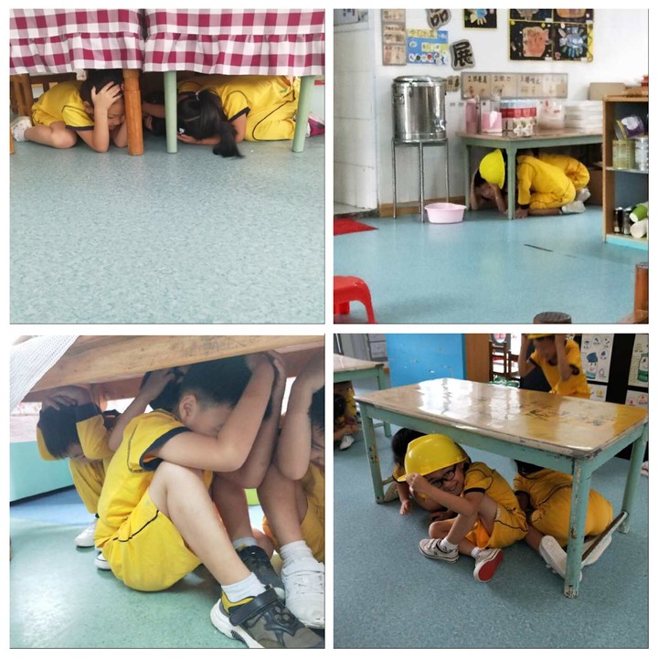 按照老師的指引,藏到桌子底下避險