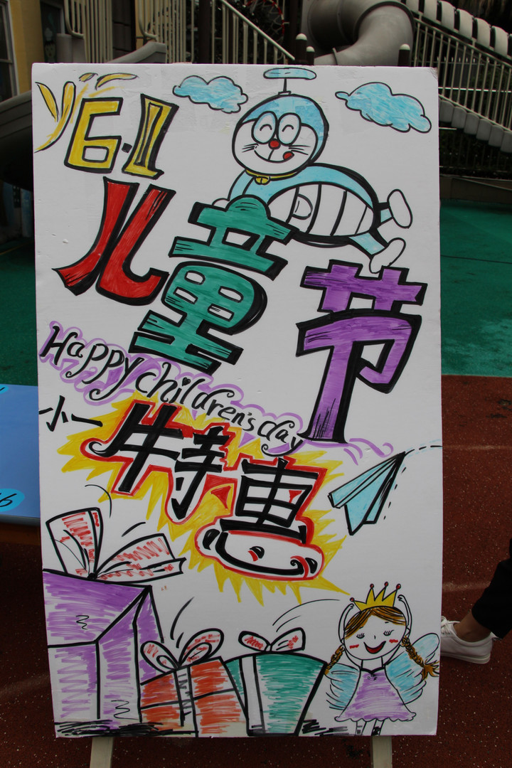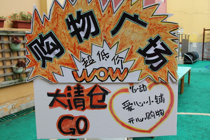 在義賣現(xiàn)場,大家都精心設計了漂亮的招牌、宣傳廣告,豐富多彩的廣告標語為今天的義賣增添了不色彩。看我們的小朋友們,坐在自己班的攤位前,家長們也在一旁協(xié)助著,想出各色各樣的口號來吸引其他小顧客們的注意。孩子們紛紛扮演起小“老板”的角色,熱情的向往來的小“顧客”推銷自己的商品。