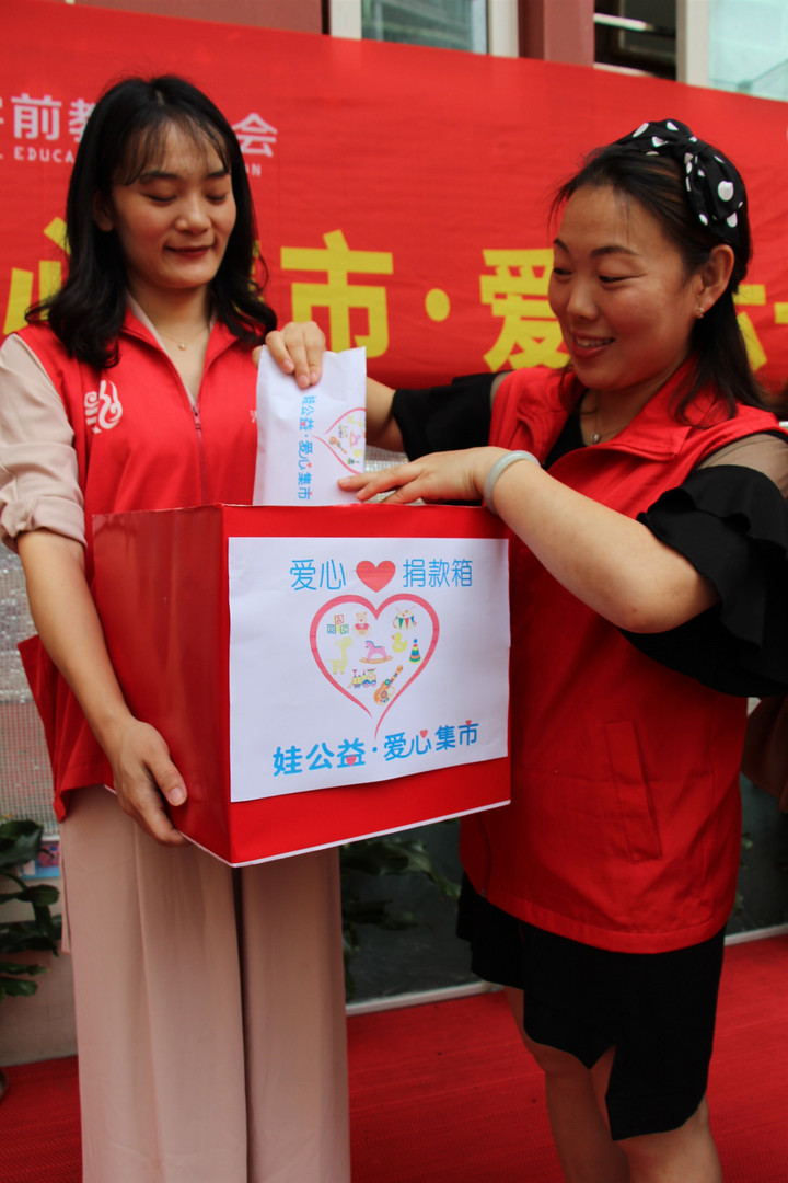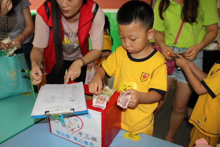 義賣活動結(jié)束后小朋友和家長共同把義賣得到的錢投入到募捐箱內(nèi),并由行政老師清點捐款。