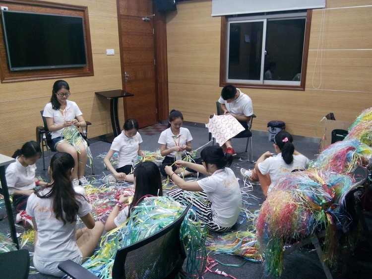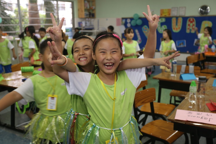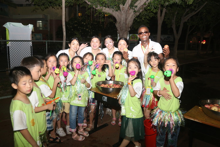 為了準(zhǔn)備此次主題活動,全體教職工們都付出了辛勤的汗水。教師們積極準(zhǔn)備材料,助教們不辭辛苦、加班加點(diǎn)地為全體師生精心趕制草裙300余條,外教Keiron用土豆雕刻出許多叢林印章,藝體教師們?yōu)楹⒆觽冄b扮各種叢林造型的面部彩繪、蓋上叢林印章,為晚會營造了良好的亞馬遜叢林氛圍。