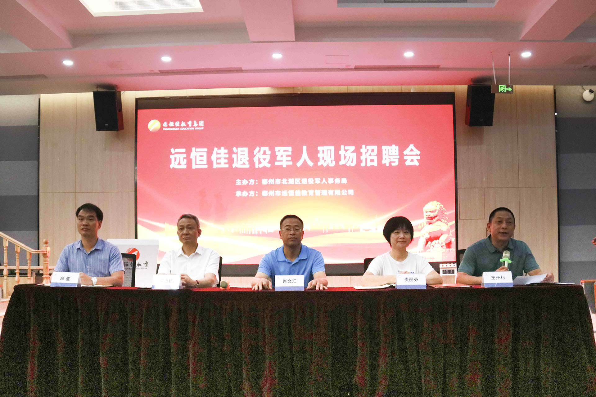 北湖區(qū)退役軍人事務(wù)局副局長肖文匯(左三),遠(yuǎn)恒佳教育集團(tuán)黨總支書記、董事長宋遠(yuǎn)標(biāo)(左二),集團(tuán)董事、副總裁麥麗芬(右二),郴州遠(yuǎn)恒佳學(xué)校副校長鄧盛(左一)參加招聘會,遠(yuǎn)恒佳郴州公司總經(jīng)理王開利(右一)主持招聘會。